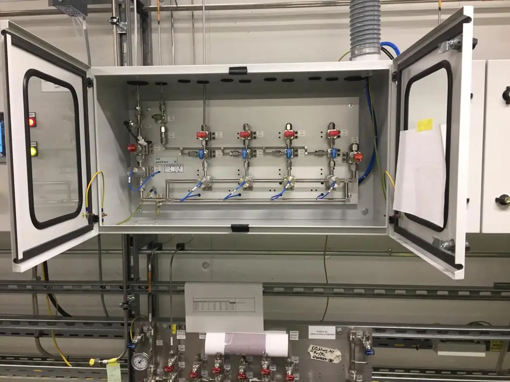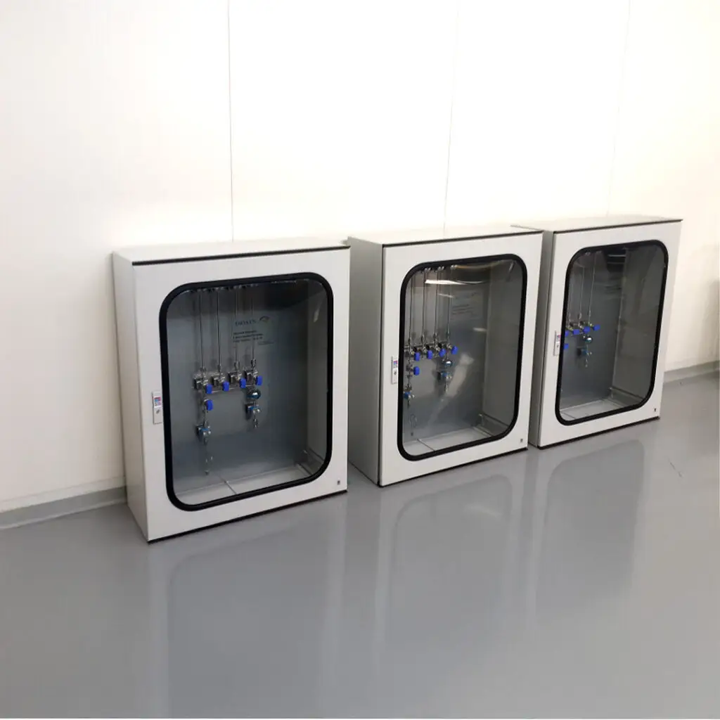 Gas valve manifold boxes (VMBs) are designed to take a single source gas and distribute to multiple tools and be able to service components within the VMB with vent and purge features to safely change out or remove the gas stick without takings all you tools down. Valve manifold boxes serve as distribution box or may allow multiple compatible gases to enter and exit with the ability to vent and purge while other processes are still running. These boxes are designed to be as simple as gas isolation box or vent and purge stick assemblies with devices to monitor life safety events, such as high pressure, excess flow to trigger emergency shutoff valves all monitor with PLC based controllers. offers standard manual gas boxes, as well as semi-automatic gas boxes with pneumatic ESO valves and life safety controllers. 4-stick vmbs and 8-stick vmbs configurations are available, as well as single gas sticks and gas stick assemblies that allow for gas distribution through multiple outputs from a single-source supply without the need for a gas valve box enclosure when warranted.